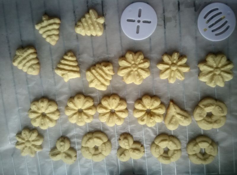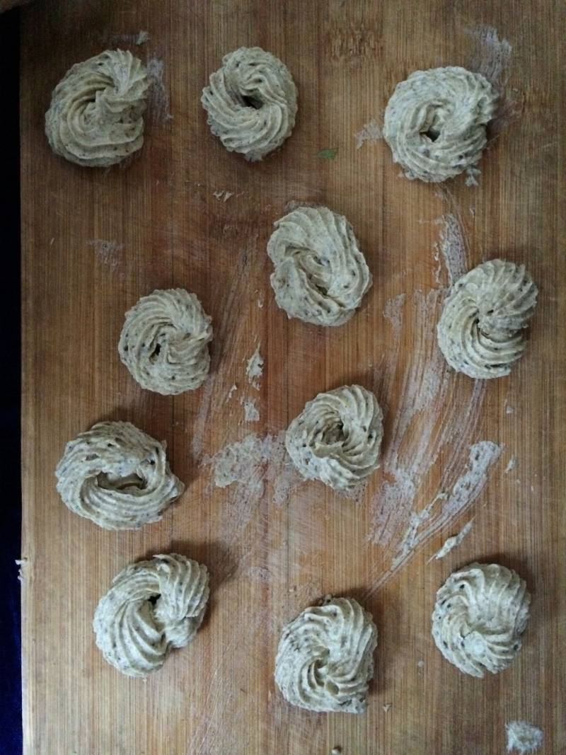6:香草味的就不多说了。黄油加糖粉打发,滴入几滴香草精,筛入低粉和奶粉混合均匀,装入裱花袋挤出形状就可以了。