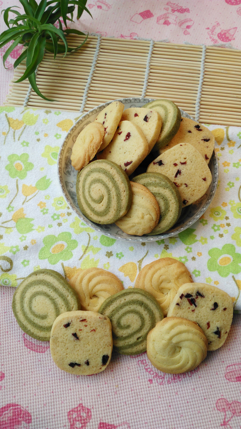 蔓越莓曲奇:低粉115克;全蛋液19克;黄油60克;糖粉40克;蔓越莓适量;