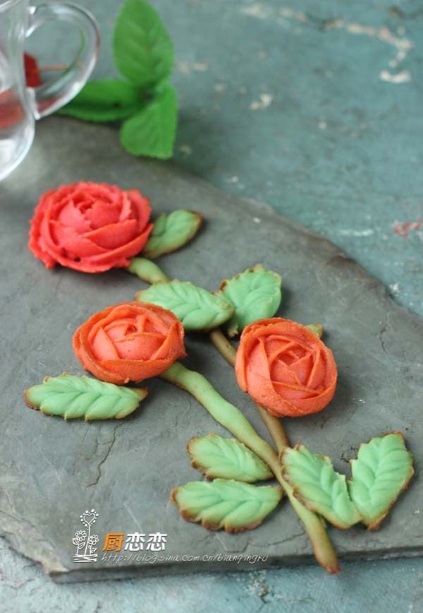 10:装入裱花袋(叶子同样是使用104裱花嘴),挤出叶子和花梗,烤箱预热160度烤15分钟