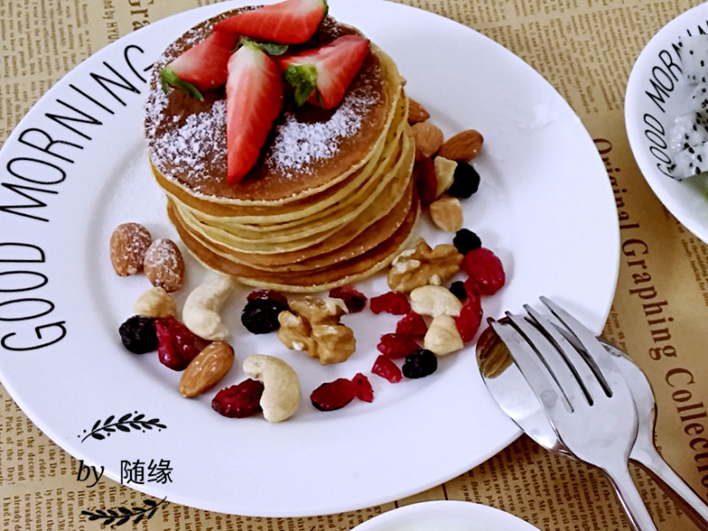 8:做好的松饼叠加,上面摆水果,干果,撒糖粉或者淋蜂蜜,觉得怎么好看怎么摆。
