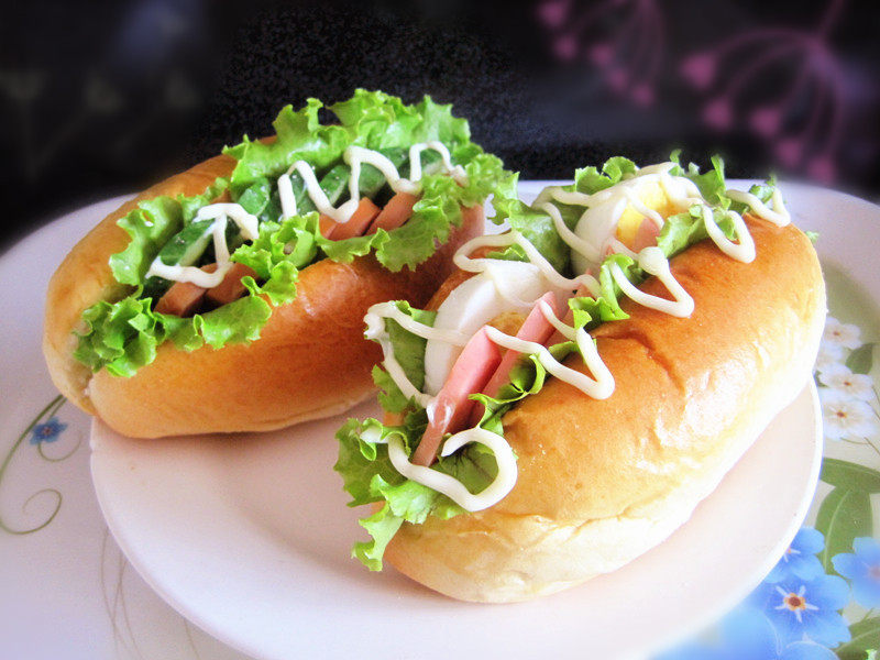 9:在切口夹入生菜叶,放上一根油煎或烤过的火腿肠,再挤上沙拉酱即可。