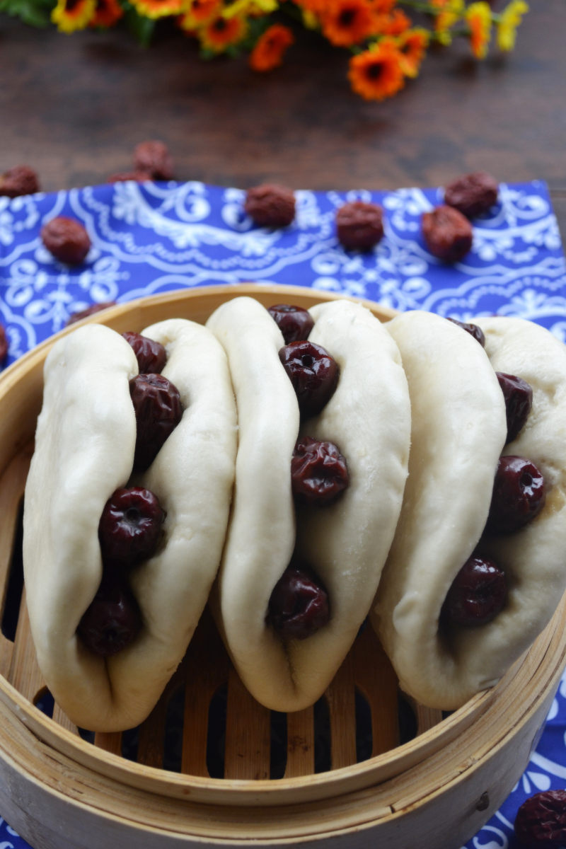 18:笼屉上刷油,放入枣馍,加盖饧15分钟。入开水锅蒸25分钟。关火虚蒸3分钟。