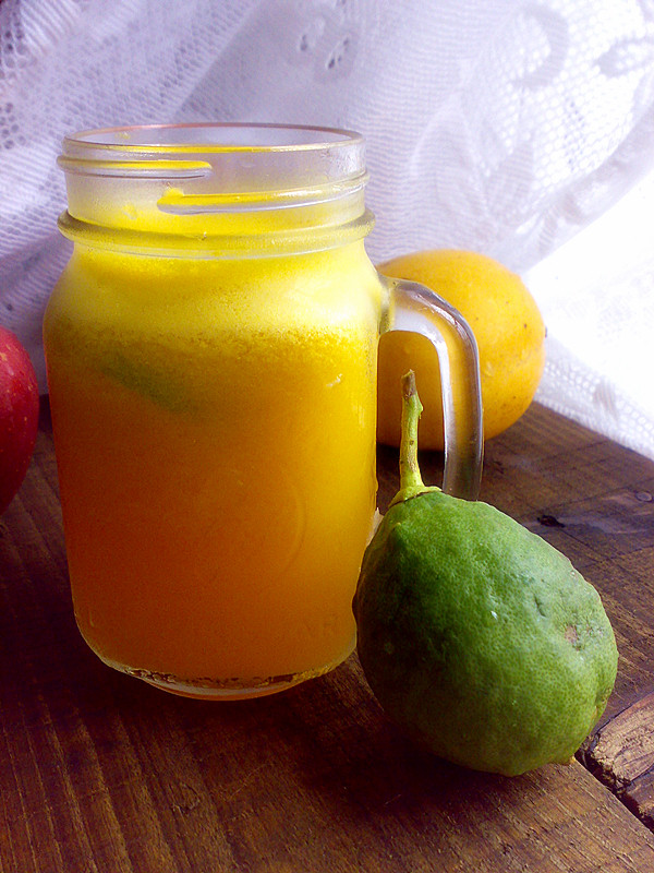 4:开动榨汁机把材料汁液榨出,用冰过的杯子装好,放几片柠檬泡里面,拌均匀即可饮用