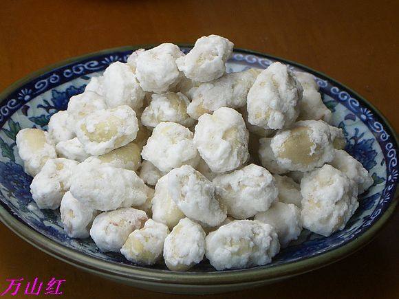 7:玉米淀粉提前炒熟,此时均匀的筛入锅中,边筛要边搅拌花生米,