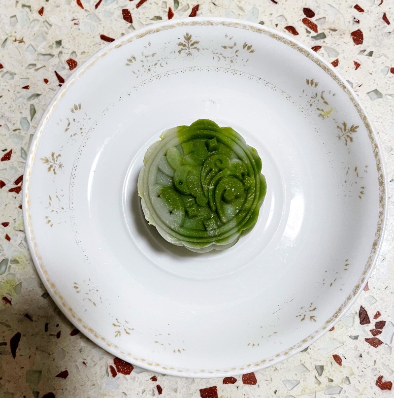 13:冰皮的制作跟月饼制作省略,冰皮只要把冰皮材料混合,过筛,蒸30分钟蒸熟后,揉成团,一半面团加5g斑斓粉,使用的时候可以10g斑斓面团,10g原味面团,揉在一起包入30g馅料,月饼模压成型。