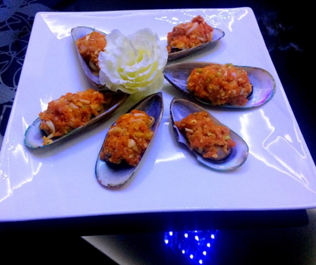 4:取出青口贝,饰以欧芹和黑胡椒粉装盘。