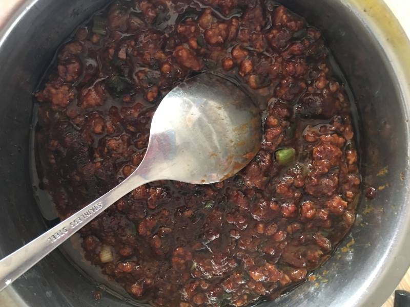 2:炒锅做油烧热把适量葱和姜蒜到入锅中在放肉馅翻炒,肉馅炒出油放入兑好的酱料在放生下的半碗水熬制粘凋放入生下的葱和辣椒炒均匀出锅