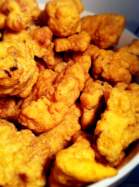 7:油烧到六成热,一块一块投入锅里炸透