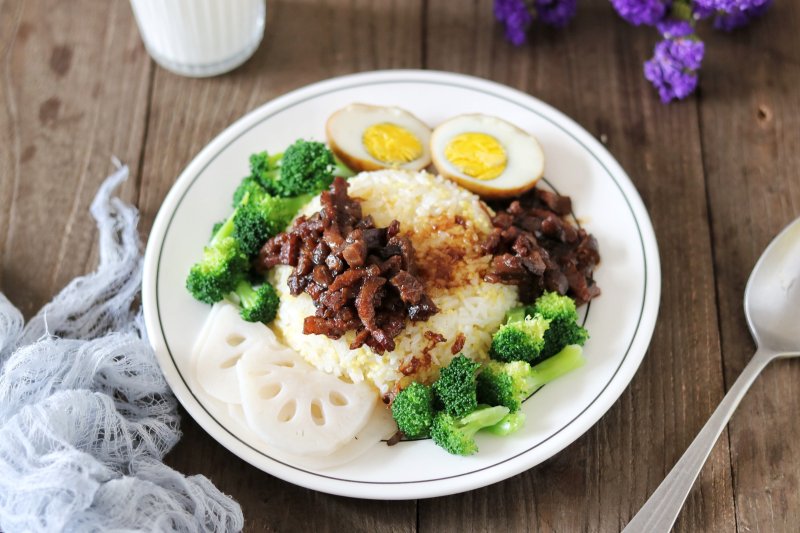 14:搭配一碗热腾腾的香香的米饭,把卤好的肉淋在米饭上,再来一颗溏心的卤蛋就可以了。