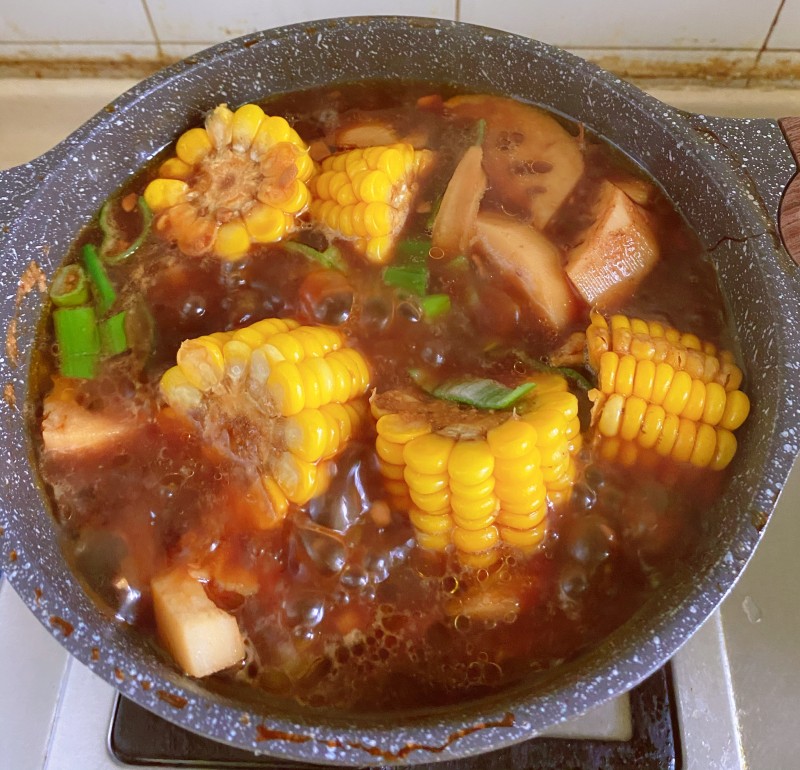 4:再放入焯过水的鸡爪,切好的藕和玉米,倒入事先调好的料汁。