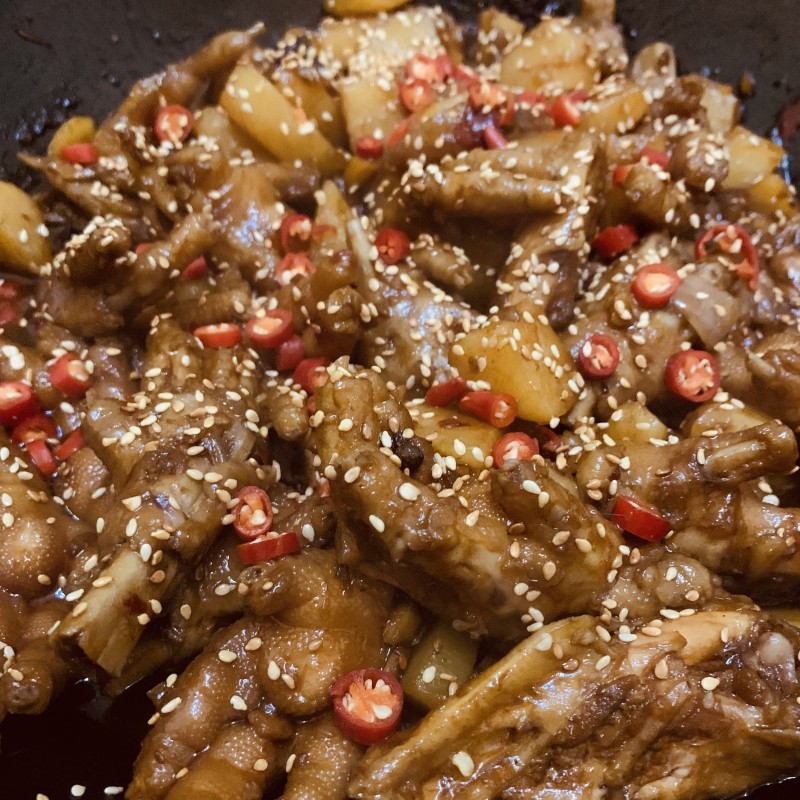 6:翻炒均匀后倒入清水,淹没鸡爪,煮沸之后加入土豆等配菜。大火收汁即可。