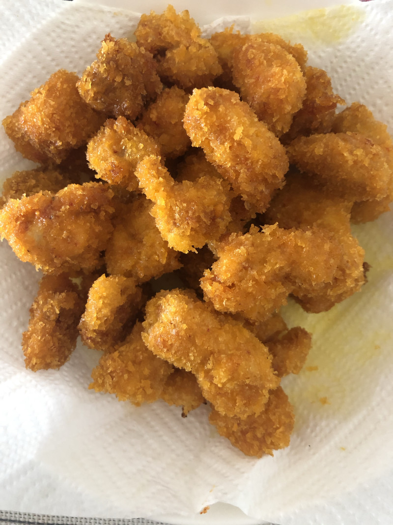 9:用鸡腿肉做的鸡米花,比鸡胸肉做的鸡米花更滑嫩。表皮酥脆,咬一口嘎吱作响,里面的鸡腿肉滑嫩,美味。