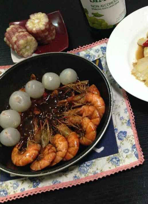 3:油烧热,姜蒜干辣椒爆香后放入南美虾,放入备用的佐料。