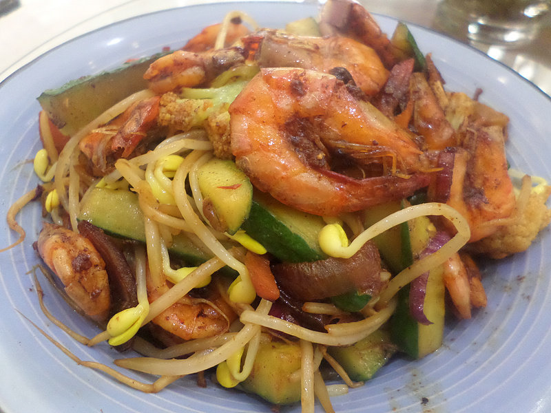 虾半斤;黄豆芽适量;黄瓜适量;洋葱适量;蒜头两瓣;姜少许;胡萝卜少许;菜花适量;