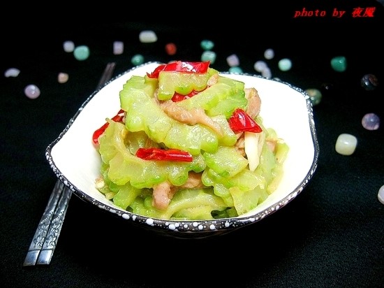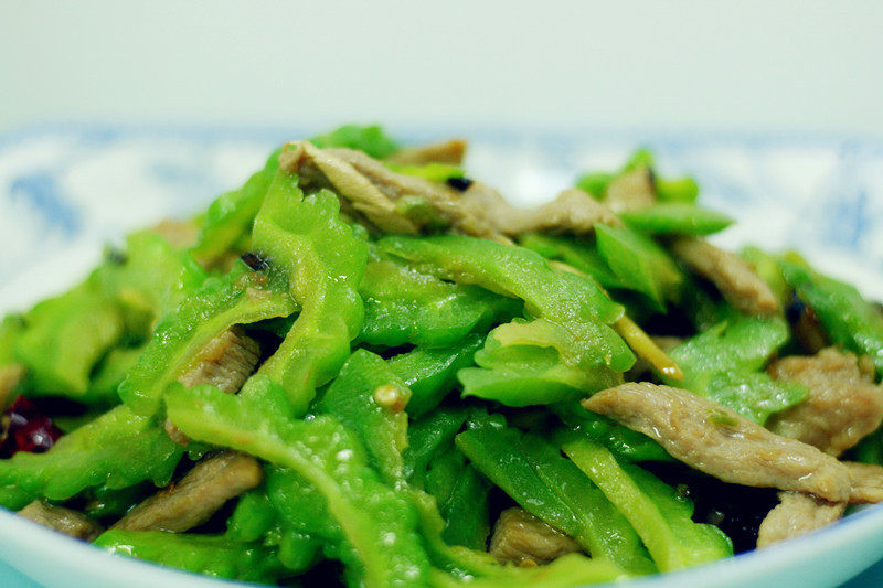 5:再下入油烧热,倒入青椒苦瓜翻炒,炒熟后下入炒好的肉丝,放入味精就可以起锅了。