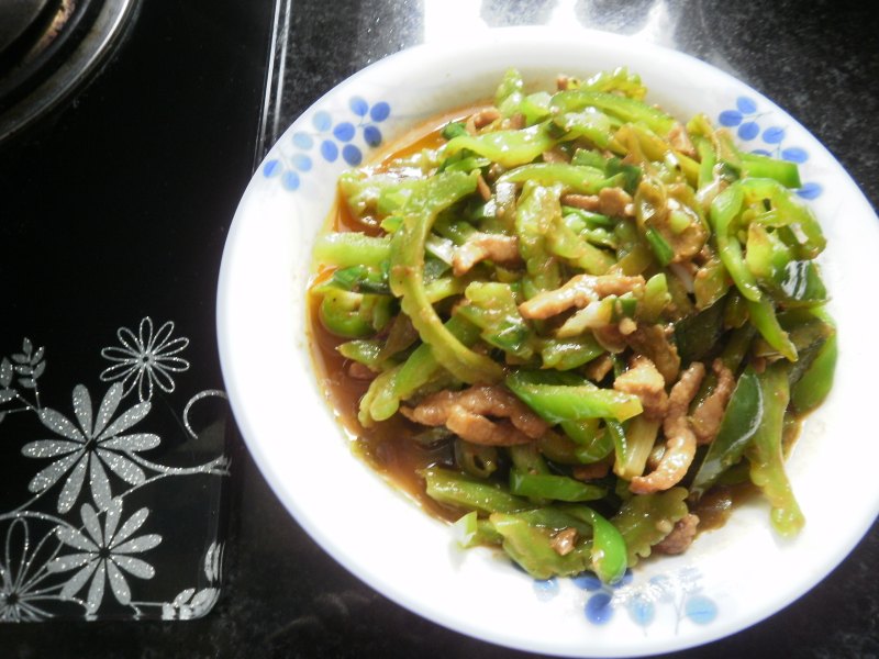 4:锅烧热放油,倒入肉丝大火翻炒一下,加入线椒和蒜翻炒几下,再倒入苦瓜煸炒一下,加盐和生抽调味即可。