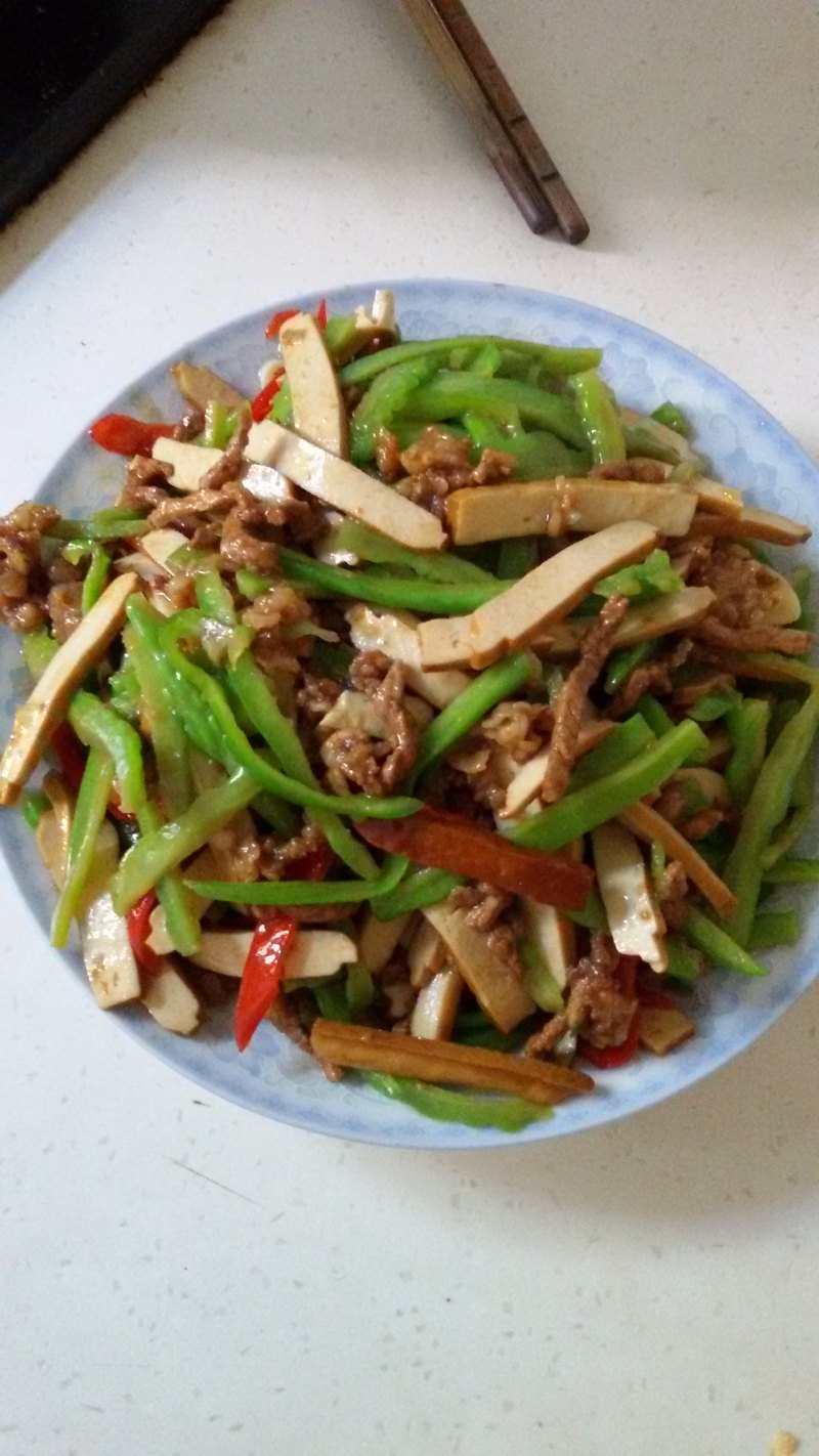 香干适量;肉丝适量;苦瓜适量;青红椒适量;蒜头适量;