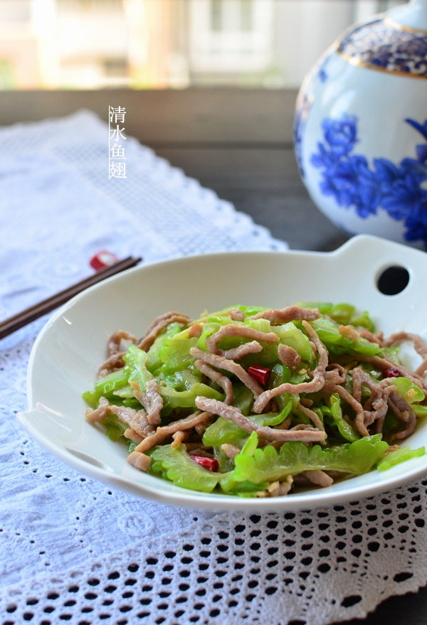 肉丝炒苦瓜是一道经典的家常小炒,精髓在于苦瓜的处理与火候的把握。先将苦瓜去瓤切薄片,用盐稍腌并焯水,能有效去除部分苦味,保留清脆口感。瘦肉切丝,以生抽、淀粉腌制入味。热锅快炒肉丝至变色后盛出,再爆香蒜末,下苦瓜猛火翻炒,最后汇入肉丝,加盐、糖等调味,迅速出锅。成菜肉丝滑嫩,苦瓜脆爽微苦,回味甘香,是夏日里一道开胃下饭的绝佳选择。