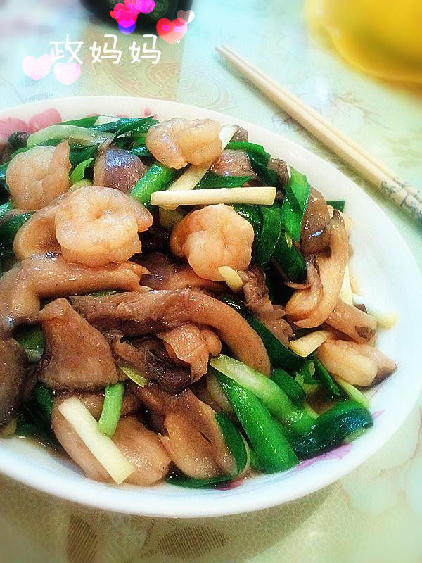 平菇300克;韭菜50克;虾仁150克;