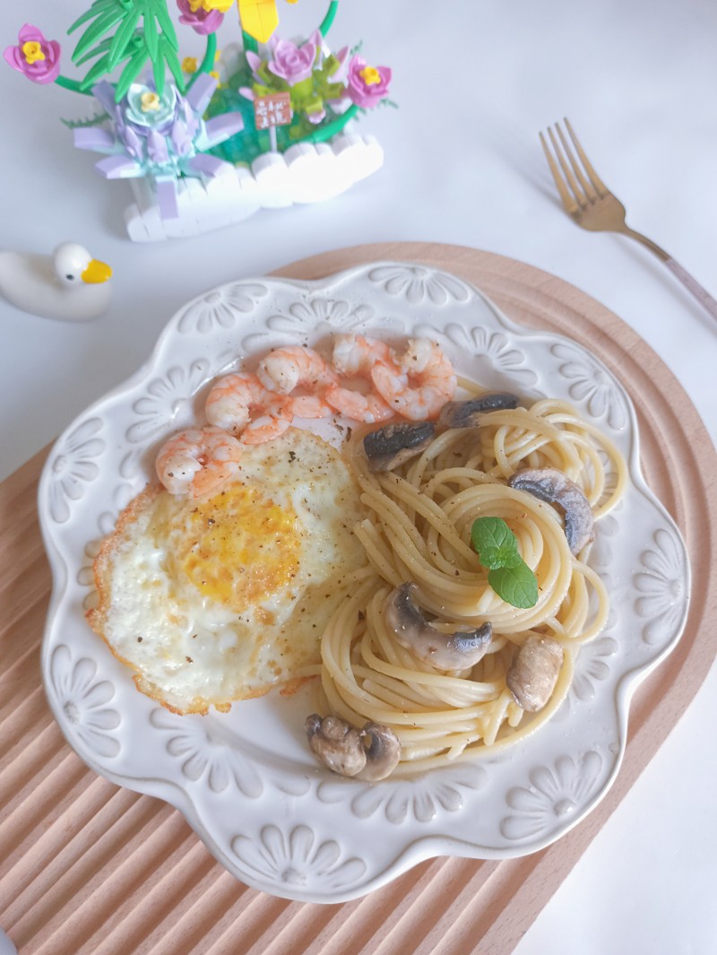 虾仁口蘑荷包蛋意面
