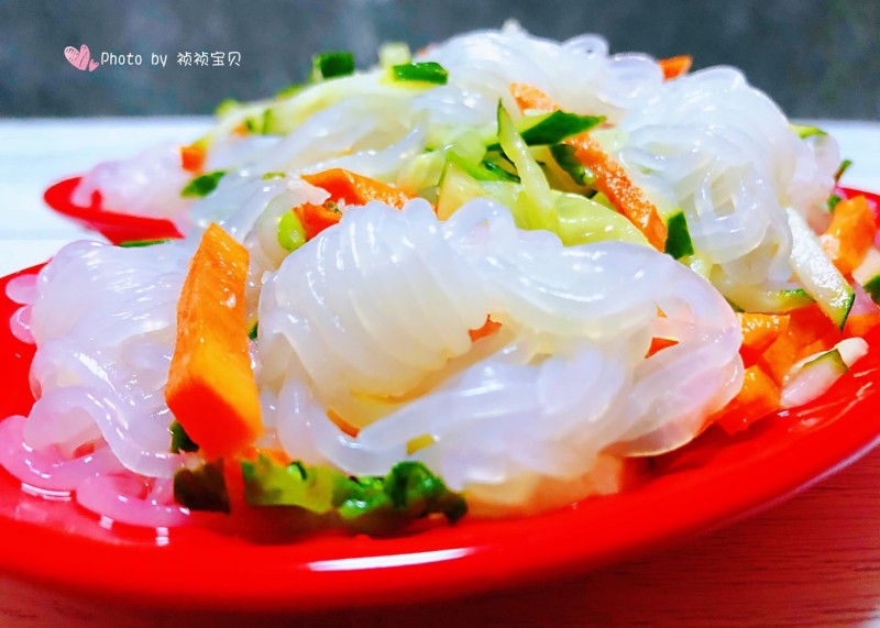 2:黄瓜切丝,也放入盘中。加入盐、香醋、麻辣油、香油,拌匀。