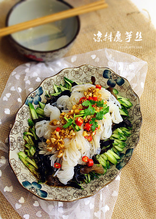 1:将魔芋丝在开水中氽烫5分钟,盛出装盘