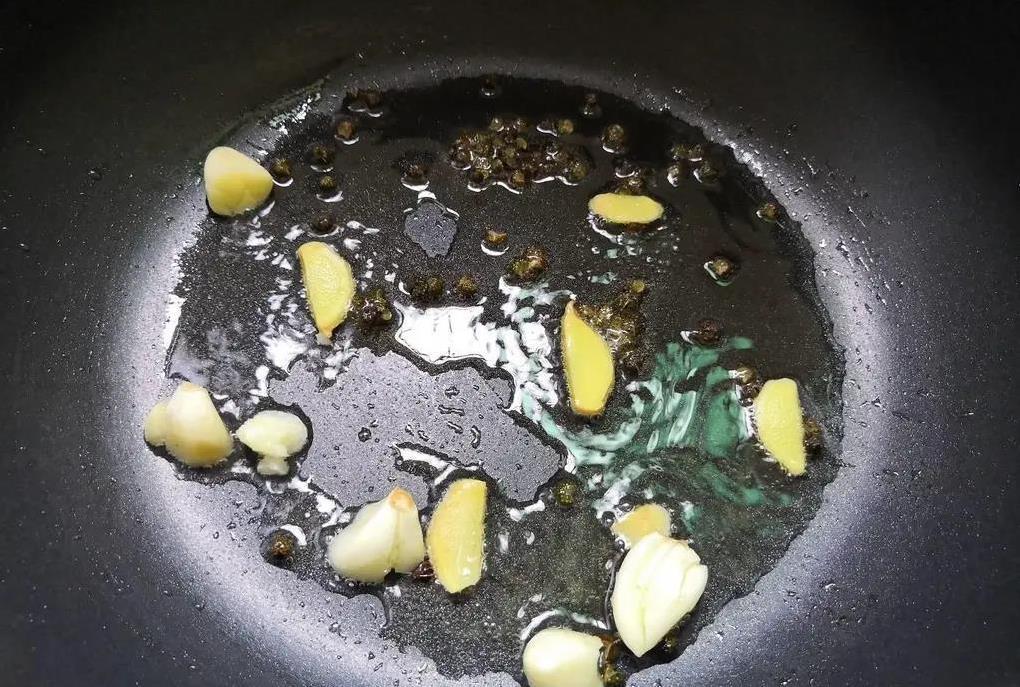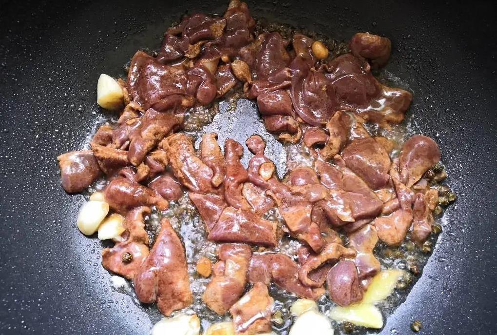 炒菜得用热锅热油。锅里倒油,烧热后扔点姜片、蒜末和花椒,炒出香味。猪肝下锅,翻炒到变色就行,时间别太长,大概一分钟左右。炒久了猪肝就老了,咬不动,口感差。炒好的猪肝先盛出来,留着备用。