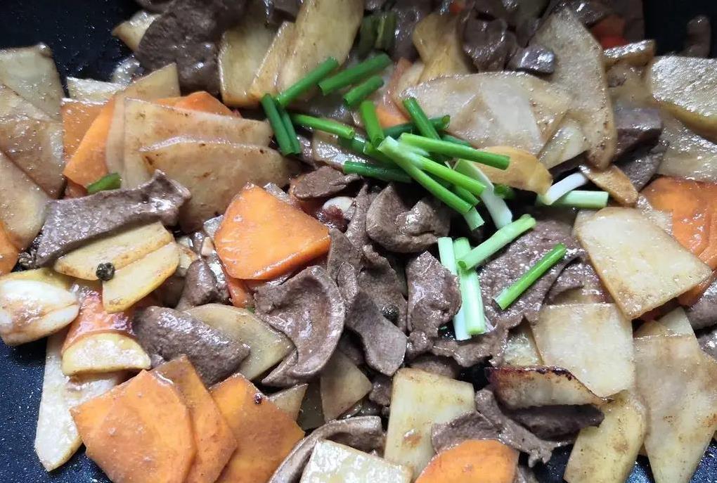 锅里再加点油,把土豆片和红萝卜片倒进去,炒到八成熟。土豆软了,红萝卜微微透亮,这时候把猪肝倒回去。加点青红辣椒,提提颜色和味道。喜欢辣的可以多放点辣椒,家里有小孩的就少放点,像我家只加了一点点青红椒,微微辣,孩子也能吃。
