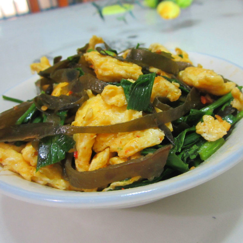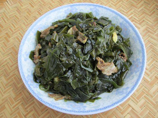 9:加入海带丝翻炒1分钟左右,调入适量盐即可