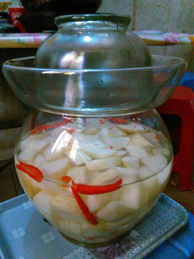 10:把萝卜放入玻璃坛中,加入白醋,淹过白萝卜即可。(夏天1天左右就可以吃了,冬天2到3天才可以吃。)