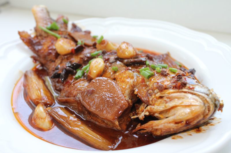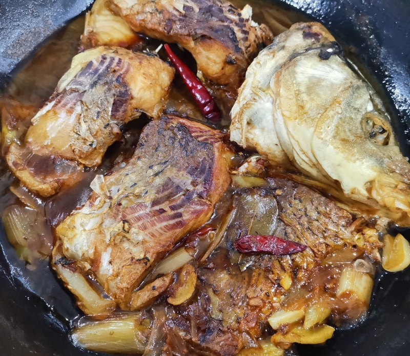 9:放入煎好的鱼块,加入生抽,白糖,料酒烧开炖10分钟。