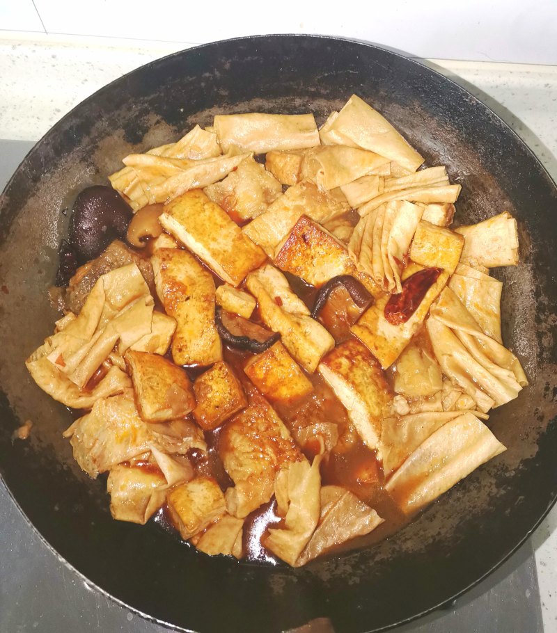 豆节适量;北豆腐1块;香菇4朵;葱适量;郫县豆瓣酱2勺;干红辣椒3个;香叶2片;姜适量;蒜适量;