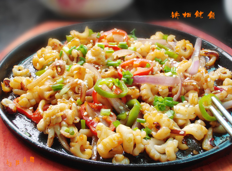 5:铁板加油烧热,倒入鱿鱼煎熟;