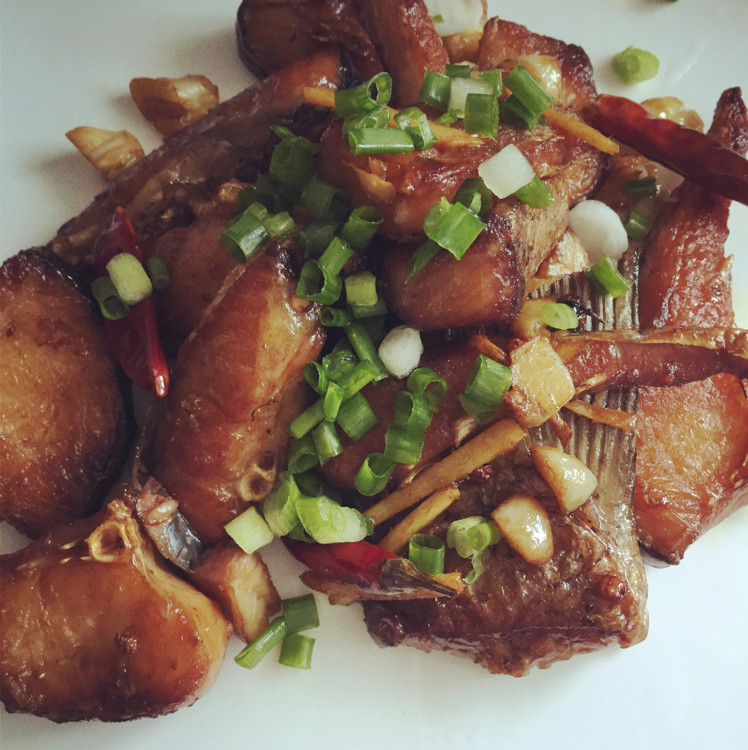 1:鱼拿到太阳下晒半天,鱼至半干状态就可以。平底锅少油中小火煎至各面焦黄