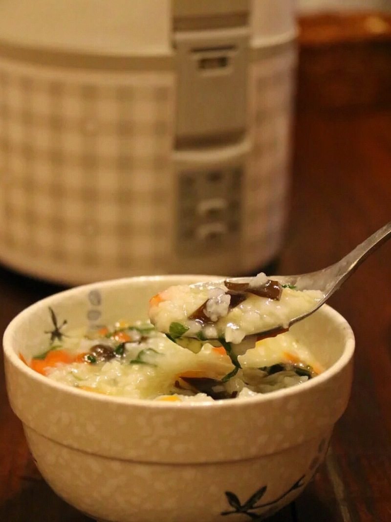 2:粥煮成这种水量的时候,放胡萝卜丝,木耳碎。