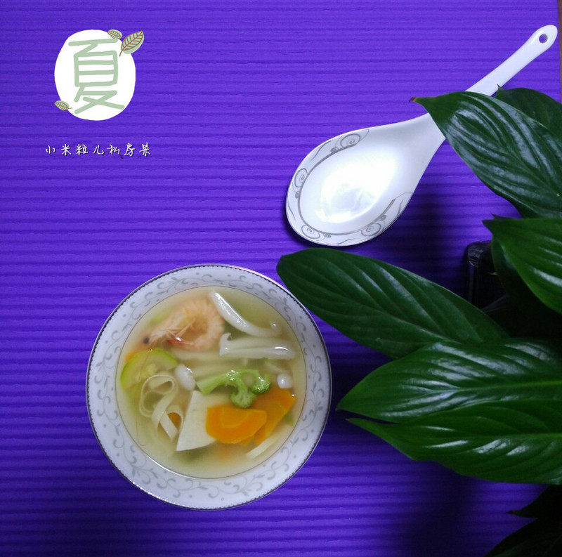 海虾4只;豆腐半块;胡萝卜半根;西葫芦半根;白玉菇20个;豆皮半张;西兰花1大朵;