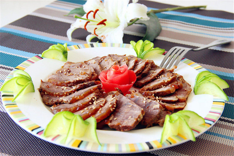 11:浸泡一夜后,让肉充分入味,切片装盘,撒上白芝麻即可