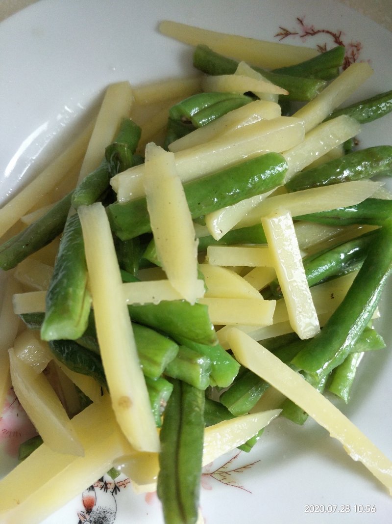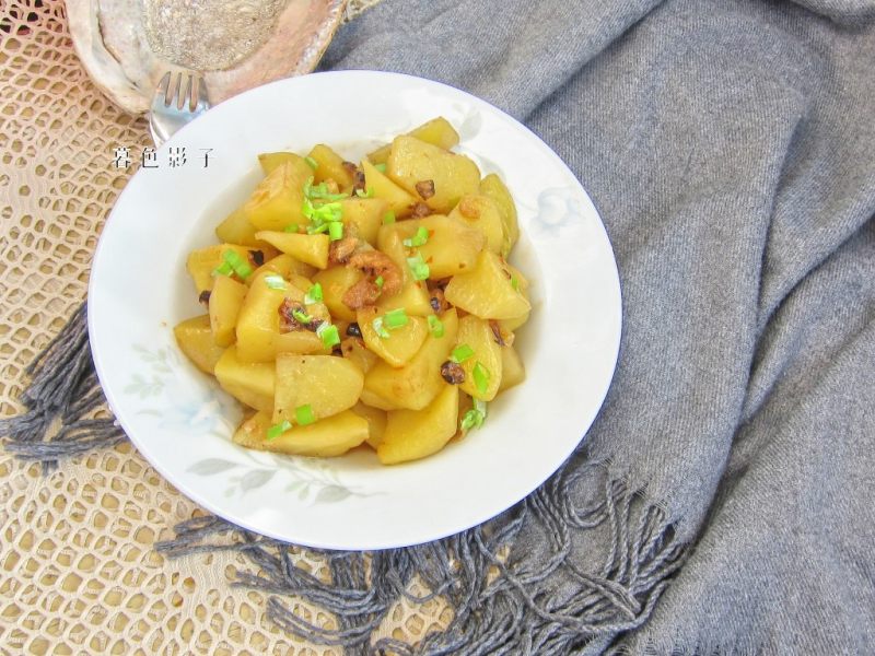 2:热锅下油,加土豆、盐翻炒、翻炒至土豆开始变软加入大蒜一起翻炒。