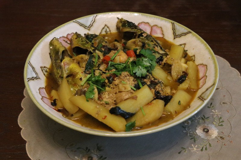 13:美味滴刀鱼炖茼蒿摆入盘中