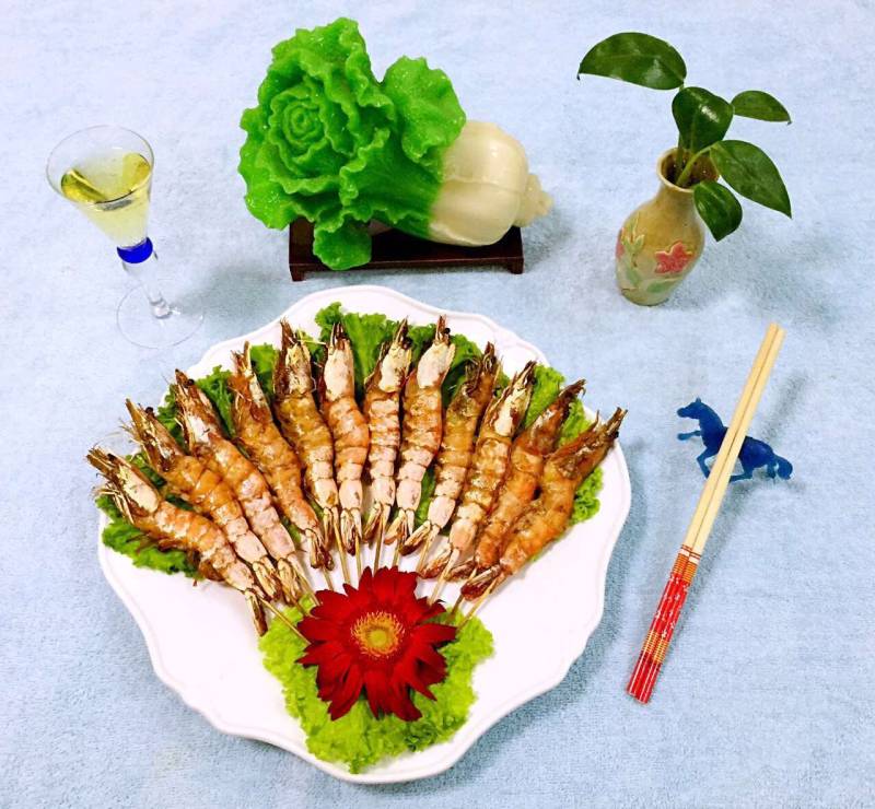 7:烤好的海虾摆入盘中用生菜和花朵做装饰
