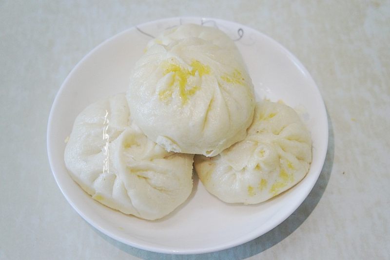 (煎饺子也可以这样煎喔!)煎好了添到盘子里,可以配少许辣酱一起蘸着吃。多余的包子可以蒸熟放在冰箱速冻,以后随吃随拿!