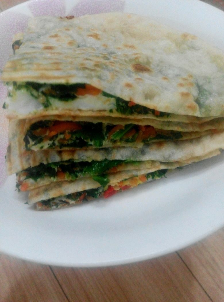 6:把菜均匀的铺在面片上,再打入一个鸡蛋