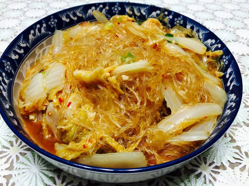 7:把白菜拨到锅的一边,粉丝放入用筷子挑拌使其吃汁入味