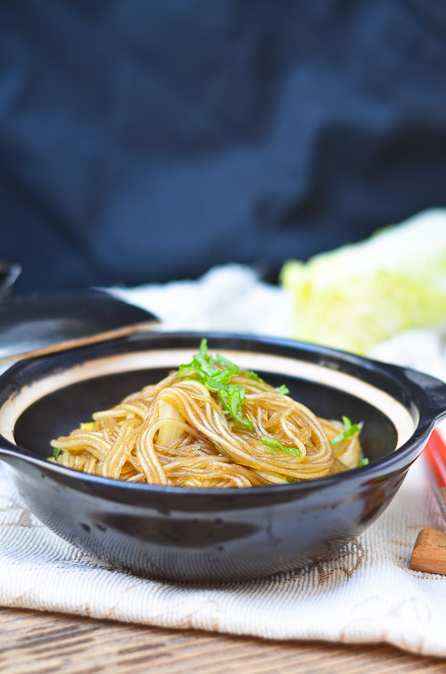 这样的菜适合用砂锅直接焖煮。我的小锅很方便,所以没有用砂锅。我所用的高汤实际上是煮鱼的汤汁,这个比较随意,用肉末或者五花肉也一样可以的。我用的纯红薯粉的粉条,用粉丝也是一样的。