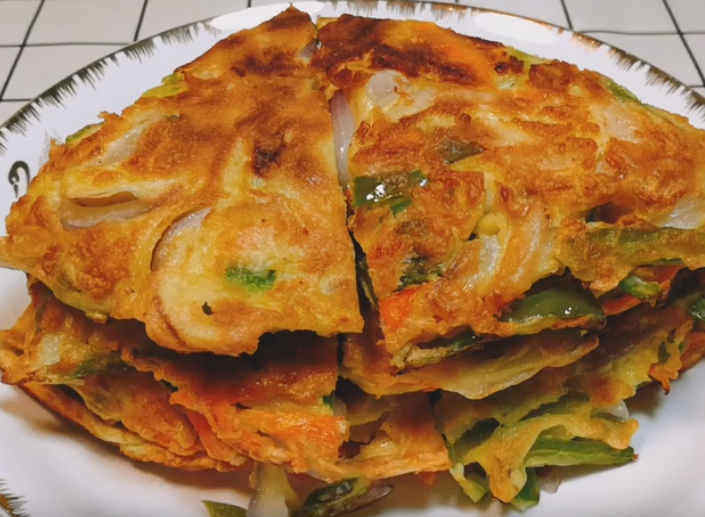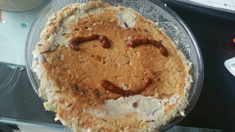 10:平底锅放少许油,倒入一层蔬菜豆渣蛋糊,平铺,将蛋糊煎成形,再翻面煎熟即可