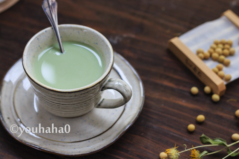 7:杯子中放入少许的豆浆,放入一小勺抹茶粉,搅匀