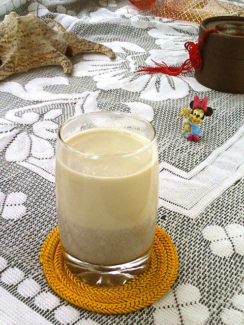 7:再倒入煮好的奶茶,插入吸管就可以喝啦!还有红豆吃,解饿又解渴。