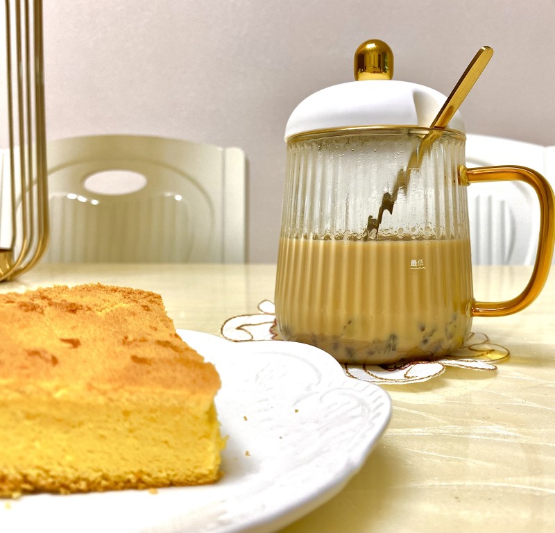 9:奶茶过筛放入杯里,下雨天奶茶 半块戚风,美滋滋。