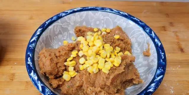 这时候,往里加半碗玉米淀粉。淀粉能让肉馅更滑嫩。盖上盖子再搅两分钟,肉馅就变得细腻光滑了。倒进大盆里,撒一把玉米粒,朝一个方向使劲儿搅拌。玉米粒让口感更丰富,搅拌上劲能让肉馅更有弹性。拌好后放一边,准备下一步。