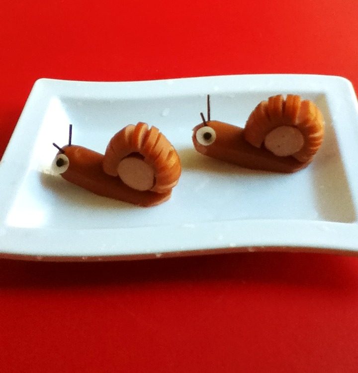 6:将粉丝剪成两根相等份,插在头上两端,再将年糕片粘点水,点上一点紫菜,粘在头的一端。整个蜗牛操作完成,用同样的做法做完另一个摆上盘。瞧!多可爱的蜗牛。